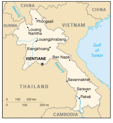 ที่ตั้ง : เป็นประเทศที่ไม่มีทางออกสู่ทะเล มีพรมแดนติดจีนและพม่าทางทิศตะวันตกเฉียงเหนือ ติดต่อกับเวียดนามทางทิศตะวันออก ติดต่อกับกัมพูชาทางทิศใต้ และติดต่อกับประเทศไทยทางทิศตะวันตก พื้นที่ : 236,800 ตารางกิโลเมตร (ประมาณครึ่งหนึ่งของประเทศไทย)